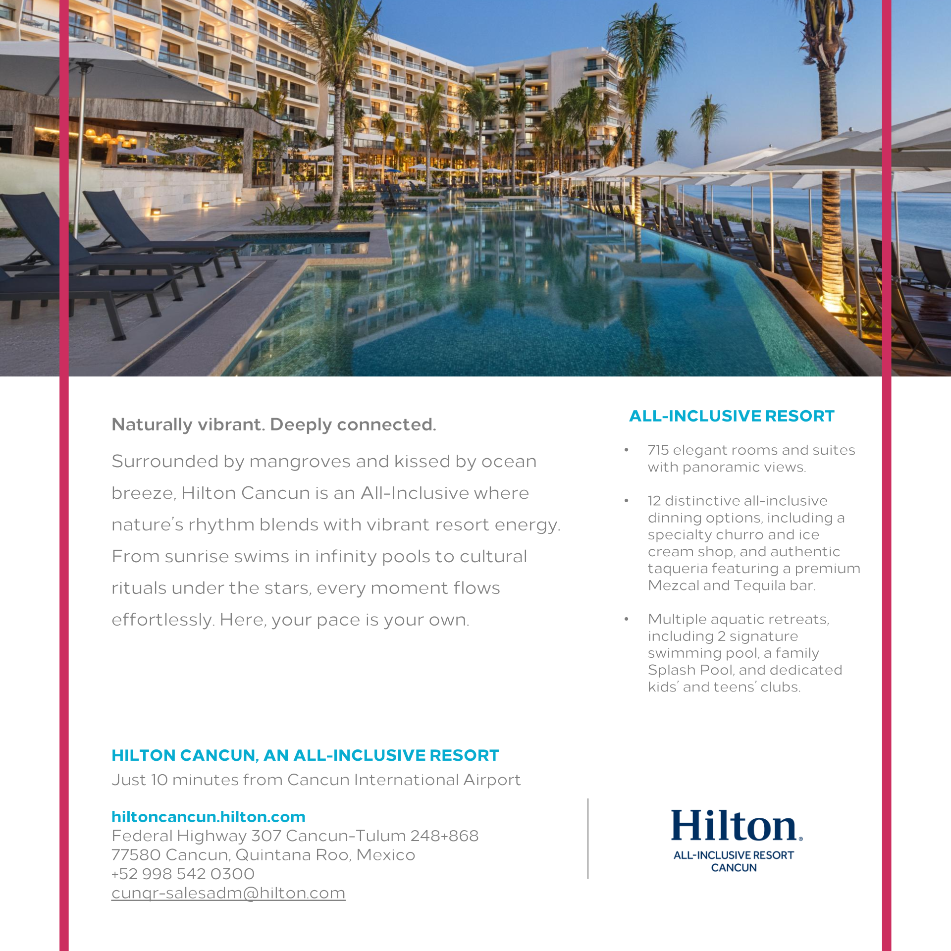 Escape to paradise at Hilton Cancun, an All-Inclusive Resort, your ultimate all-inclusive resort destination. Immerse yourself in luxury on the pristine shores of the Caribbean. Indulge in exquisite dining, endless activities, and relaxation at its finest. Experience unforgettable moments, from breathtaking sunsets to exceptional service. Your dream getaway awaits.