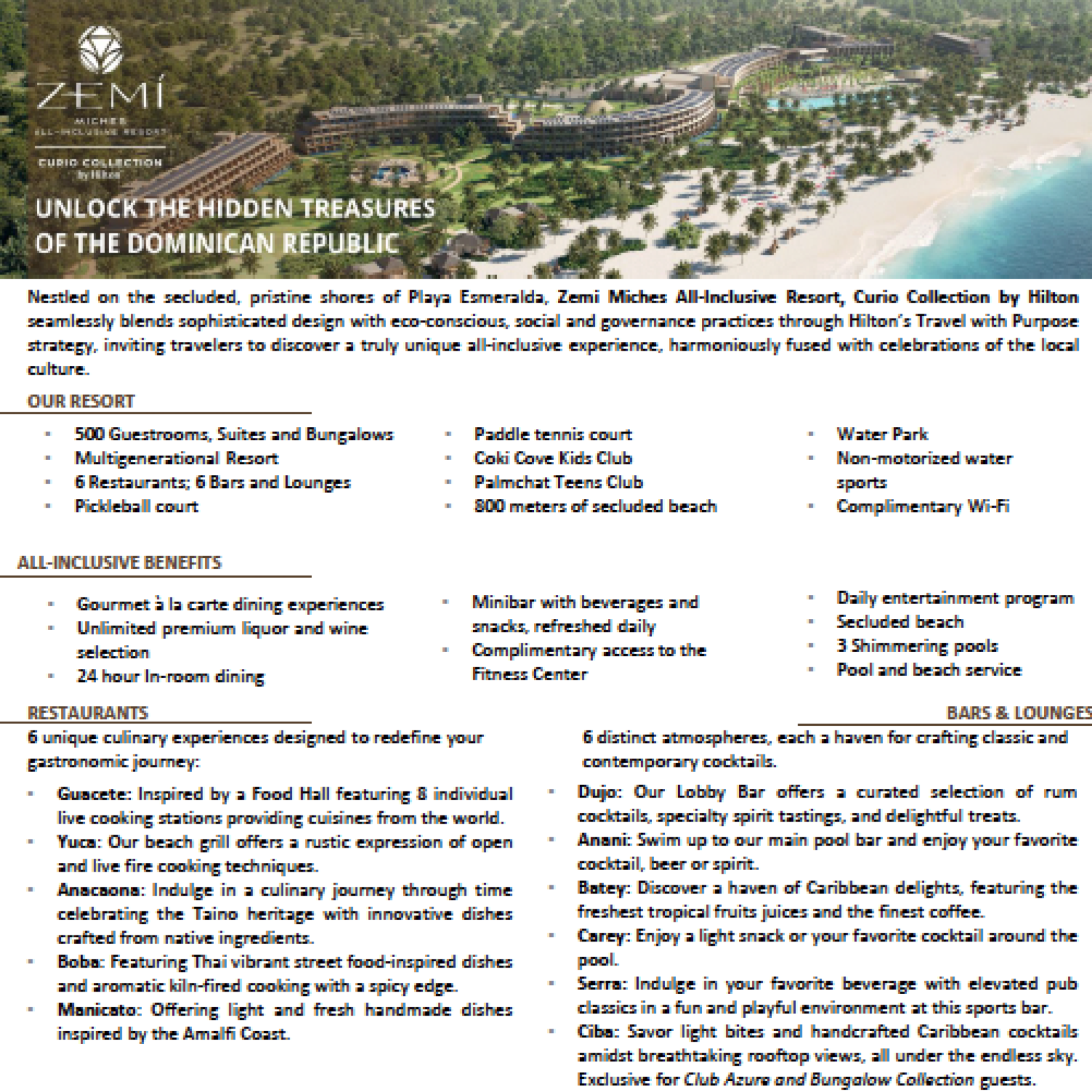 Embark on an extraordinary retreat at Zemi Miches Punta Cana All-Inclusive Resort, Curio Collection by Hilton. Nestled on the secluded, pristine shores of Playa Esmeralda, 90 minutes away from Punta Cana International Airport, our resort seamlessly blends sophisticated design with eco-conscious practices, inviting travelers to discover a truly unique all-inclusive experience. Zemi Miches is more than just a place to visit—it’s an immersive expedition into the vibrant heart of Dominican culture.